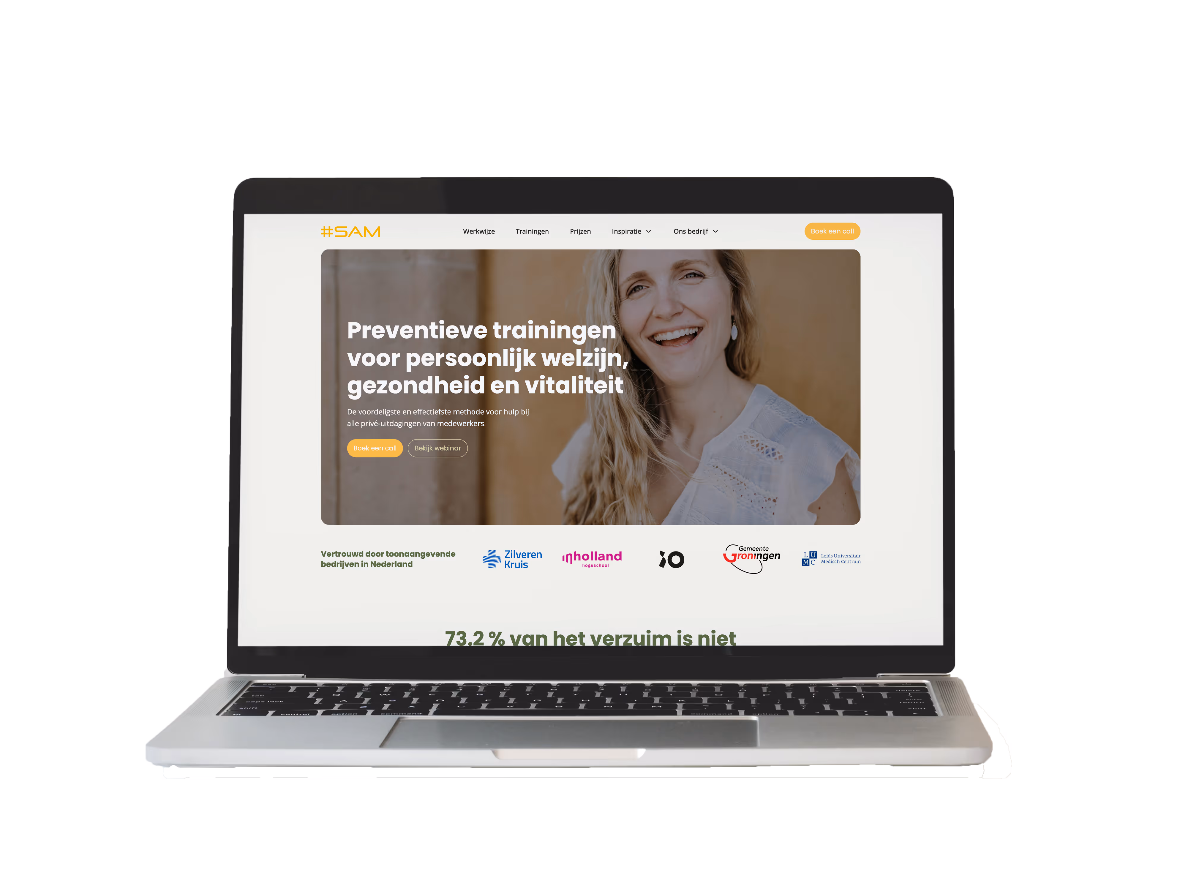 #SAM believes that the workplace is the ideal place to strengthen well-being. With their scientifically-based training and personal approach, they have already helped more than 2,400 employees with various private challenges. Their approach focuses on strengthening resilience and health, with accessibility and results at the core.
